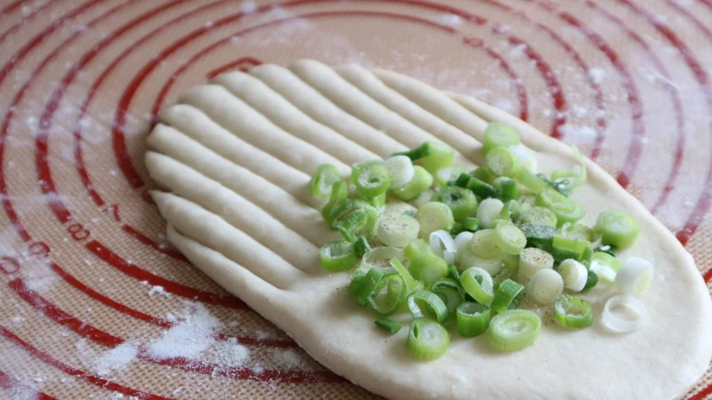 - On the green onion side, fold the two outer edges of the dough towards the middle, and start rolling from the green onion side to the side with the stripes.