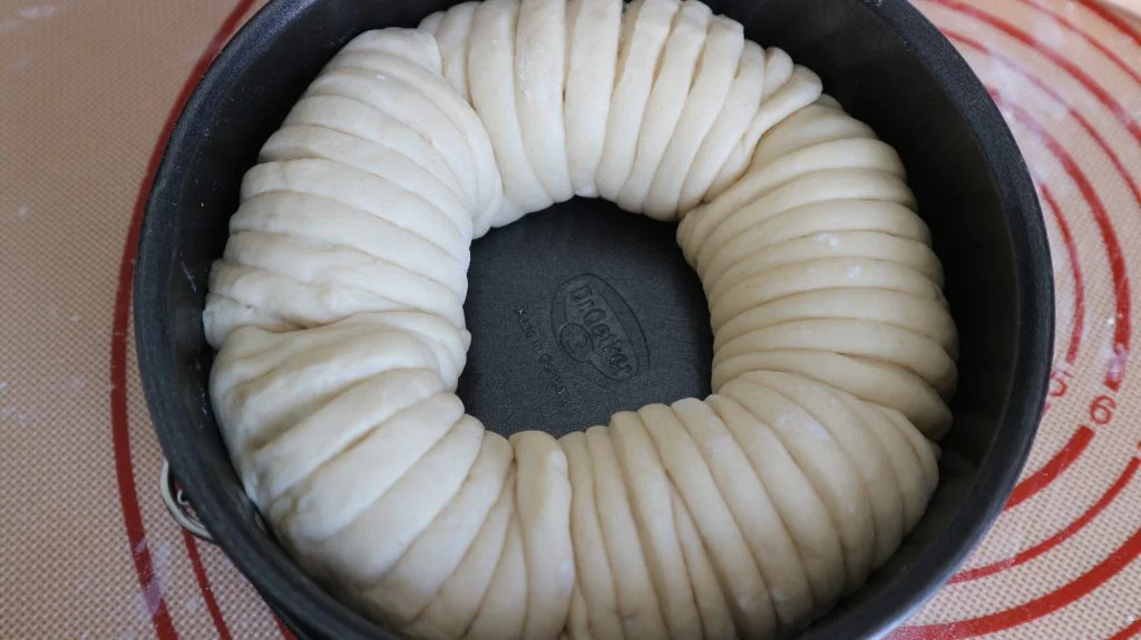 - Repeat for all 5 dough balls, and put the product in the cake form - on the edge like a ring.