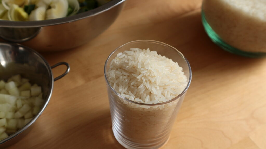 - 150 g Long grain rice Use a small cup/glass, and use the same cup/glass to measure the water/stock. (The rice to liquid ratio is 1:1.2)