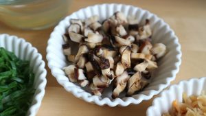 Then add Chinese mushrooms and dried scallops (also dried shrimps if you are using them). Cook for 5 minutes, and take out a spoon of the ingredients, and leave the rest continue to cook with the rice.