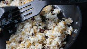 Mix the seasoning and add it to the fried rice. Stir fry until it is mixed.