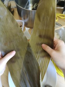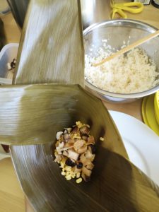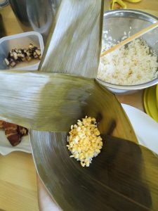 Now we are ready to close it. To make it easier to close, I add 1 extra leave just on top of the rice. (You can skip it if your dumpling is small and you are confident that you can close it without this extra one.)